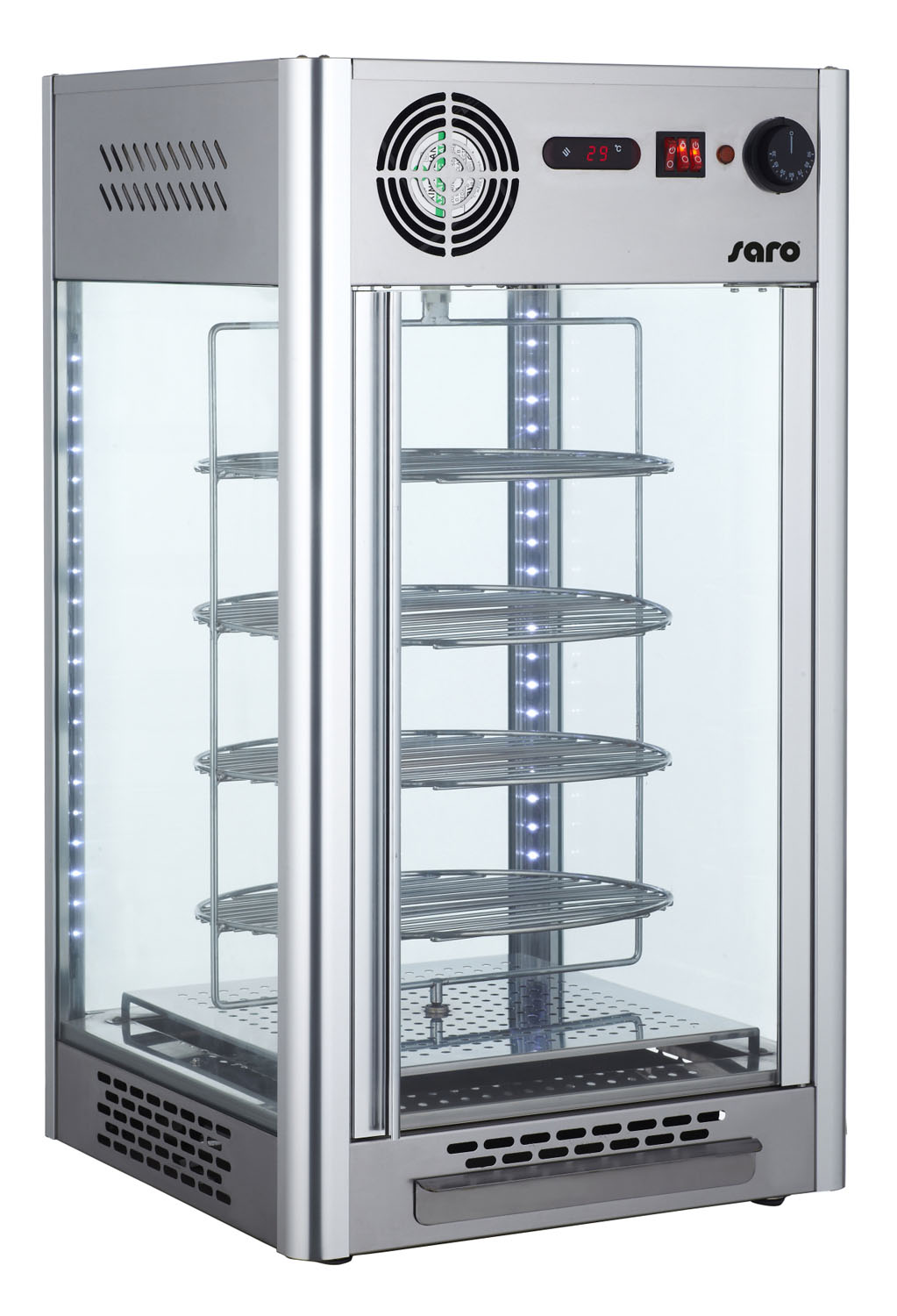 Hier kaufen Sie eine sehr schöne Heisse Theke aus dem Hause SARO als Modell LUNA mit der Artikelnummer 330-1054. Die Warmhaltevitrine ist hochwertig in Edelstahl gefertigt. Die Vitrine hat 4 rotierende Roste aus verchromt mit einem Duchmesser von Ø 350 mm. Der Abstand zwischen den Rosten beträgt 100 mm. Damit Ihr Kunde eine perfekte Übersicht hat, ist die Vitrine von allen vier Seiten einsehbar und verfügt über eine LED-Innenbeleuchtung