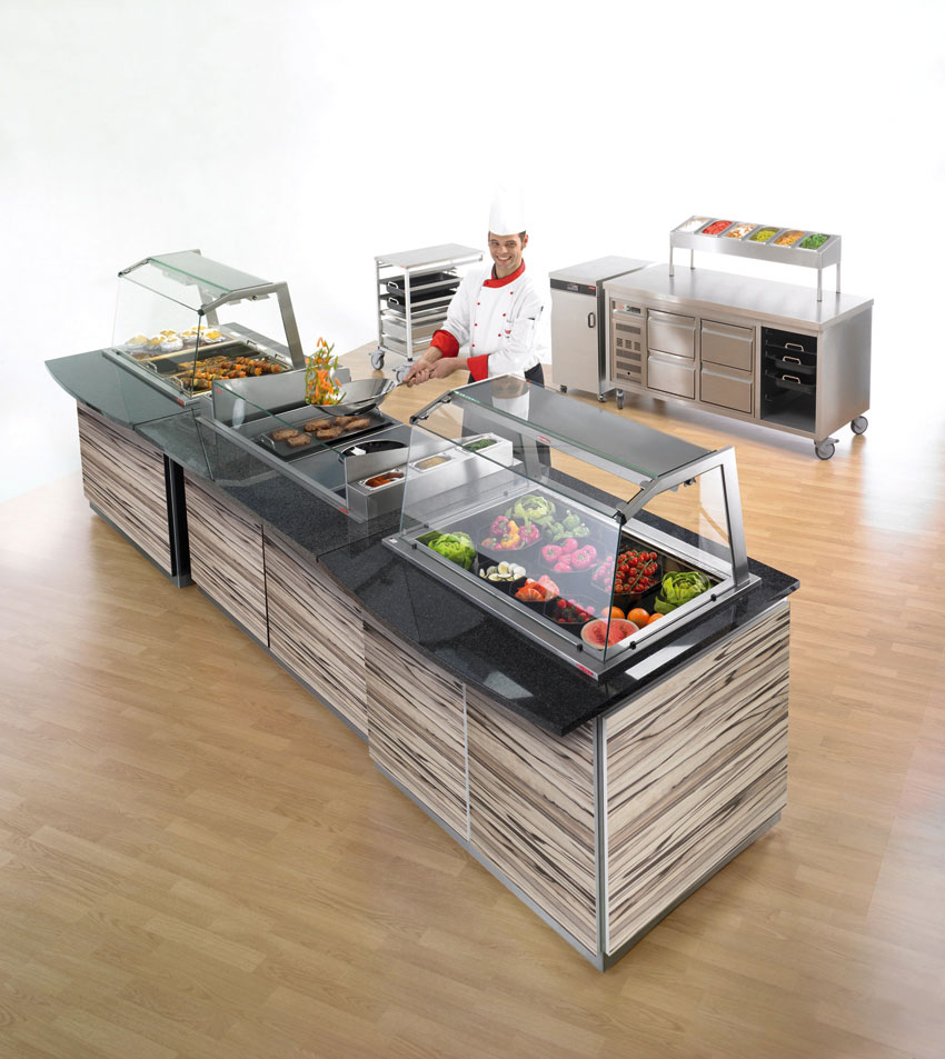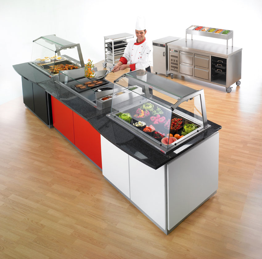 Tiefe 1000 x Höhe 900/1400 mm. Ausführung CNS 18/10. Kaltverkaufsanlage. Stille Kühlung. Auf dem Wannenrand montiert ein Hustenschutzaufsatz, incl. Seitenverglasung mit Neonbeleuchtung zur Speisenpräsentation. Unterbau dreiseitig geschlossen, mit Grundboden. Mit 3-seitiger Resopalverkleidung. Granitabdeckung 30 mm stark, an der Kundenseite verlängert als Tablettablage. Granitausführung wahlweise: Nero Impala, Rosso Multicolor, Rosso Balmoral, Viskont White. Fahrbar durch Lenkrollen Durchmesser 75 mm, 2 davon mit Feststeller.