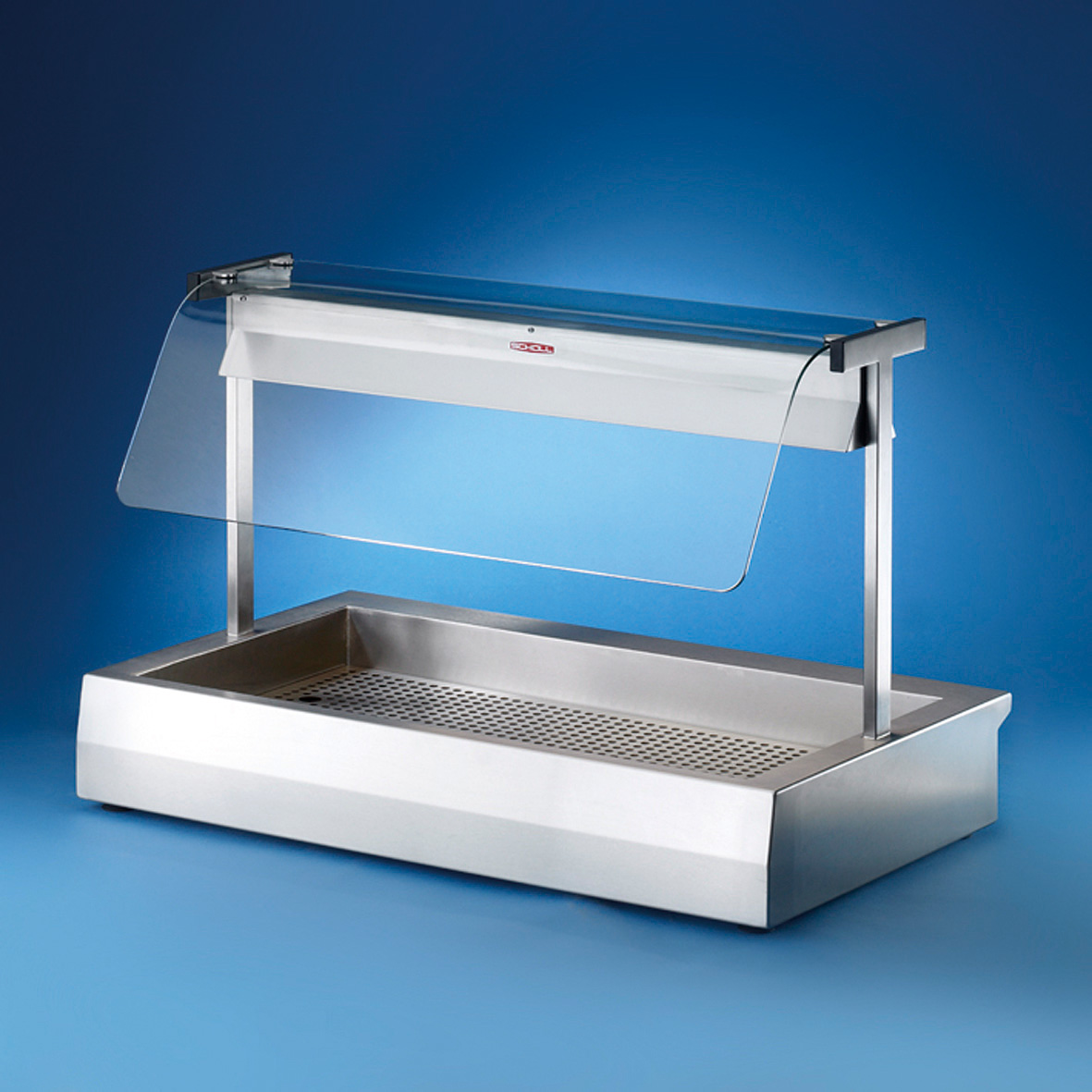 Tiefe 650 x Höhe 700 mm. Ausführung: CNS 18/10. Isolierte Kühlwanne, ohne Kühlaggregat, für Crash-Eis. Durchgehende Eiswanne mit Wasserablaß- hahn. Darauf montiert ein Hustenschutz aus Sicherheitsglas. Mit Neonbeleuchtung.