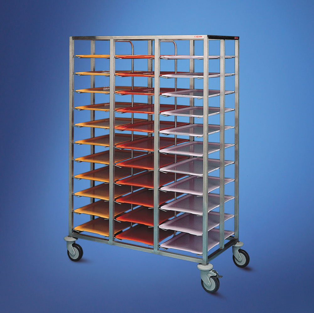 Rahmenkonstruktion aus 25/25 mm CNS Vierkantrohr, ringsum verschweißt. 3 Abteile mit CNS-Winkel- auflagen. Je Auflage wird 1 Tablett eingestellt. Höhenabstand zwischen den Auflagen 125 mm.Fassungsvermögen: 33 Tabletts. Wagen fahrbar, 4 korrosionsgeschützte kugelgelagerte Lenkrollen, 125 mm Durchmesser, davon 2 mit Feststeller, einschließlich Wandabweiser.