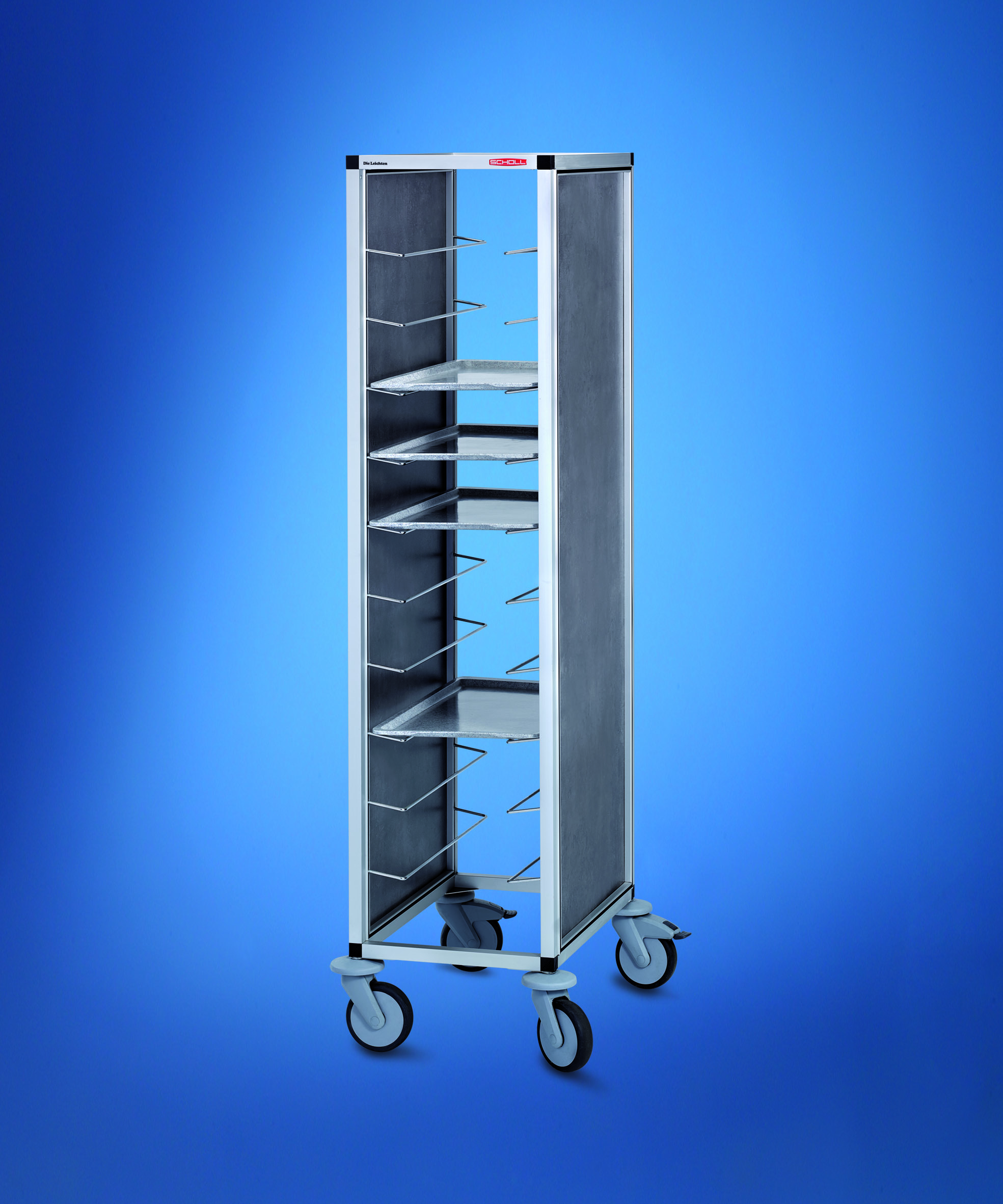 470 x 640 x 1650 mm. Rahmenkonstruktion aus silber eloxierten Spezial- Leichtmetall-Profilen. 1 Abteil mit Seitenwänden aus melaminharzbe- schichteten Platten. Tablettauflagen aus verchromtem Rundmaterial. Je Auflage kann 1 GN-Tablett der Größe 530x 325 mm eingestellt werden. Fahrbar durch 4 korrosionsgeschützte, kugel- gelagerte Lenkrollen, Durchmesser 125 mm, davon 2 mit Feststeller, einschließlich Wandabweiser.