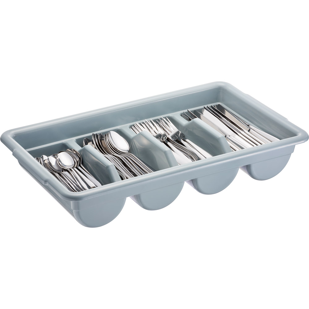 Unerlässliches Tool für die Bereithaltung und den Transport von Bestecken. In den vier tief gemuldeten Fächern mit mittig erhöhten Trennwänden lassen sich alle Hauptbestandteile e…