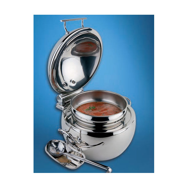 Nutezen Sie diesen sehr formschönen Induktions-Speisewärmern von Scholl und integrieren Sie Ihn bei sich im Buffetbereich an der Ausgabe. Die Suppenkugel ist in hochglänzender Ausführung. Im Lieferumfang ist der Speisenbehälter bereits inbegriffen. Seitlich haben Sie die Möglichkeit eine Löffelablage mit einzuhängen, somit verschmutzt Ihre Ausgabe nicht und die Kelle hat immer einen bestimmten Platz. Die Soup bowl hat einen Sandwichboden, dieser sorgt für eine optimale Wärmeverteilung.