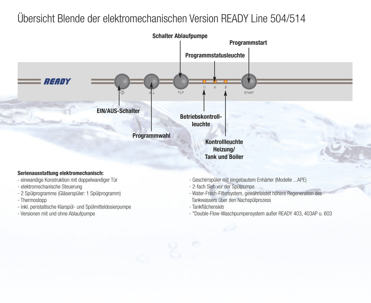 KBS Geschirrspülmaschine Ready 505 230 Volt 2022.1025 Nachfolgemodell 504, inkl. Spülmittel und Klarspülmitteldosierung, 230 V, Auf Wunsch mit Ablaufpumpe und Wasserenthärter , sparsam im Wasserverbrauch nur 2,8 Liter.