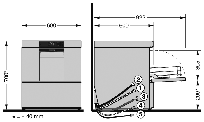 - Klarspülung 2,0 l: Durch Präzisionsdüsen werden nur 2,0 l Frischwasser pro Spülgang benötigt. Der Verbrauch von Wasser, Reinigungschemie und Energie verringert sich.