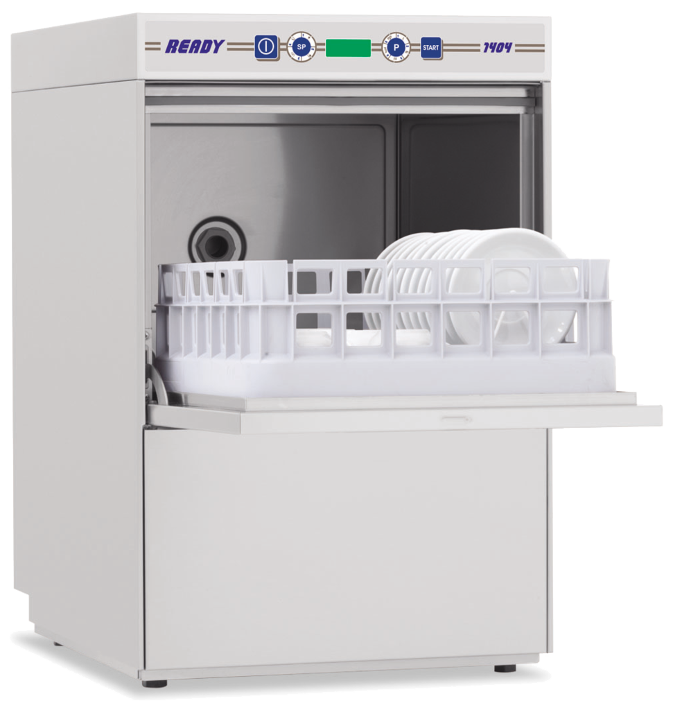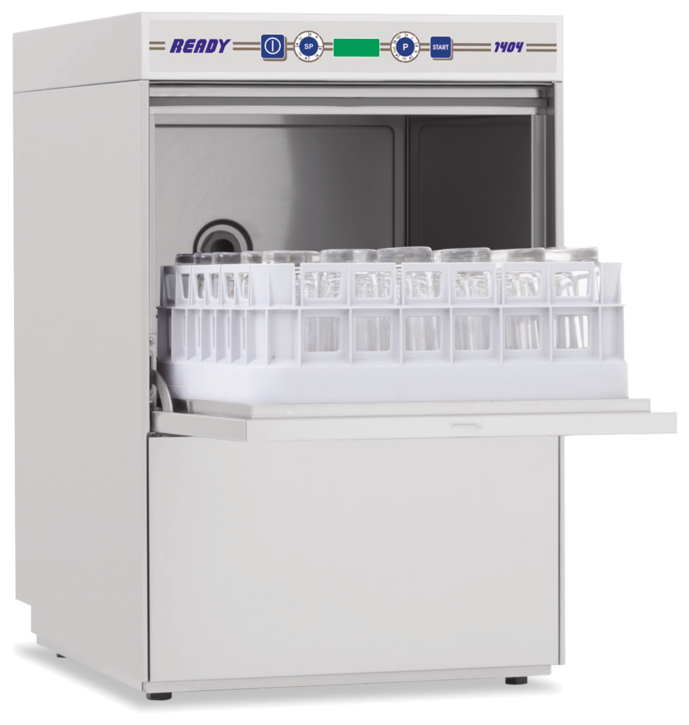 Ready 1404 doppelwandige KBS Gläserspülmaschine für die Gastronomie mit 7 Spülprogrammen, elektronischer Steuerung mit Klarspülmittel- sowie Reinigungsmittelpumpe und optional auch mit Ablaufpumpe eingebaut.