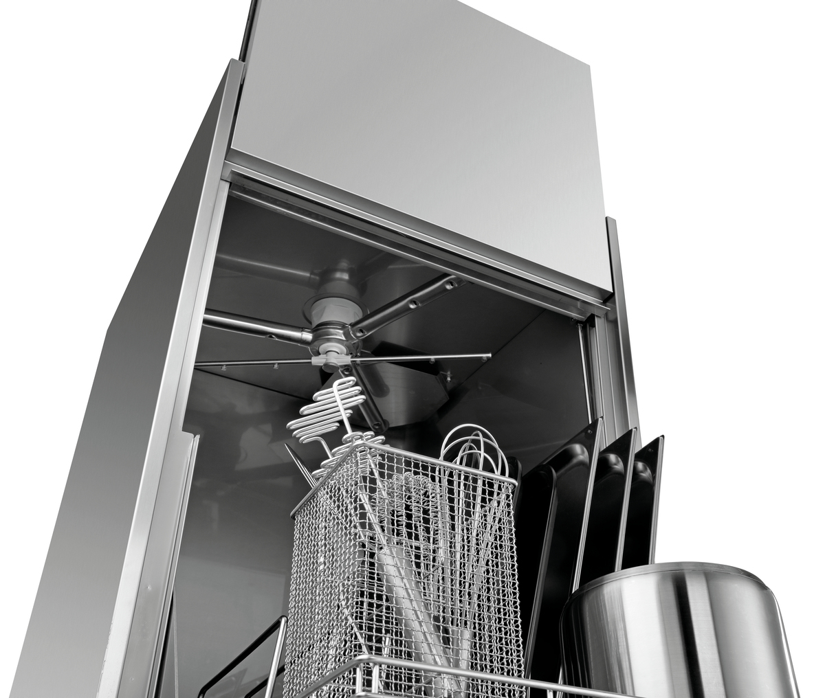 Die TS 665-1 R ist mit dem mitgelieferten Universalkorb und Tabletthalter für die Reinigung von sperrigen Spülgütern bestens geeignet. Sie sorgt für optimale Spülergebnisse bei Töpfen, Pfannen, Tabletts, Schüsseln und Schalen.