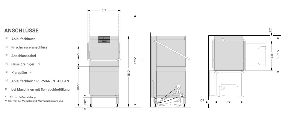 - Tiefe mit Griff 915 mm, Höhe Haube oben 1995 mm