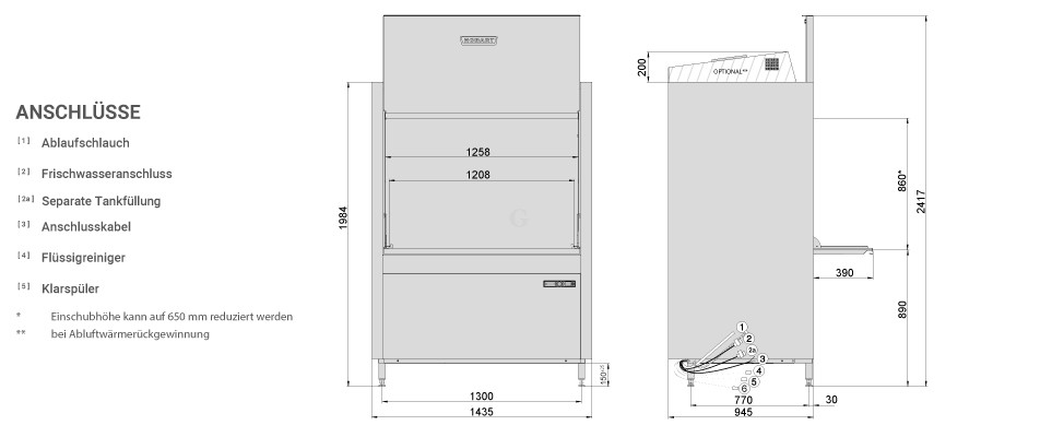 - Komplett anschlussfertig: Zu- und Ablaufschläuche, Anschlusskabel, Flüssigreiniger-Dosierpumpe, Klarspülmittel-Dosierpumpe, Klarspülpumpe, Ablaufpumpe, Rücksaugverhinderer.