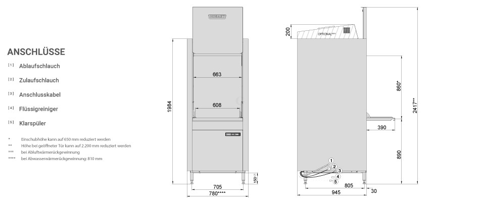 - Komplett anschlussfertig: Zu- und Ablaufschläuche, Anschlusskabel, Flüssigreiniger-Dosierpumpe, Klarspülmittel-Dosierpumpe, Klarspülpumpe, Ablaufpumpe, Rücksaugverhinderer.